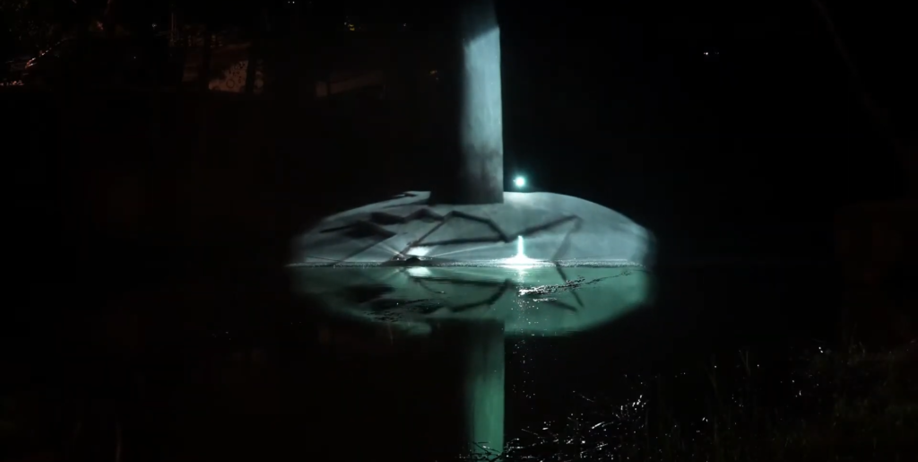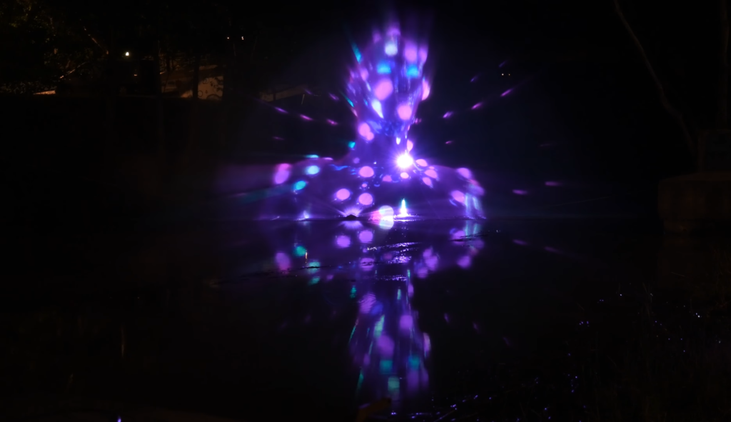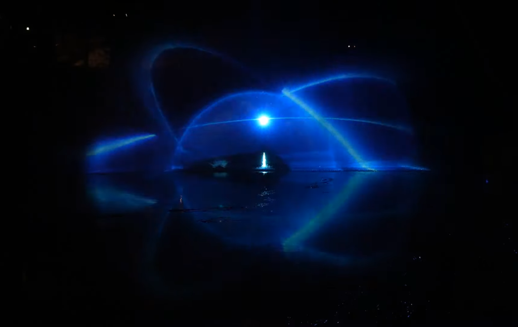 Το σιντριβάνι δημιούργησε μια διάφανη ημικυκλική υδάτινη οθόνη ύψους 5 μέτρων και πλάτους 25 μέτρων η οποία είναι κατάλληλη για προβολή γραφικών. Εκμεταλλευτήκαμε στο σχεδιασμό των 3d animation στο έπακρο τόσο τις διαστάσεις της υδάτινης οθόνης όσο και της φυσικής αντανάκλαση στο ποτάμι, δημιουργώντας πολλές φορές μια ενιαία εικόνα προβολής και αντανάκλασης μαζί.